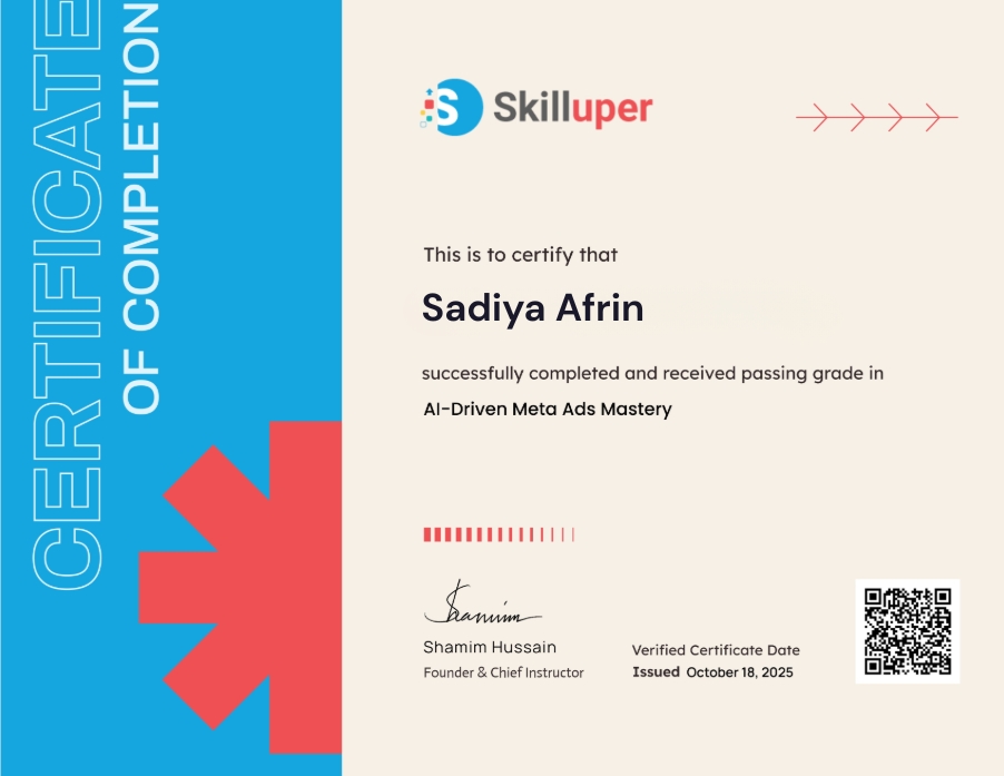 I’m Sadiya Afrin, Bangladesh’s leading digital marketer with a passion for AI-driven strategies that deliver real results. I specialize in SEO, GEO, Meta Ads, Google Ads, social media marketing, content marketing, email marketing, AI automation and more.
