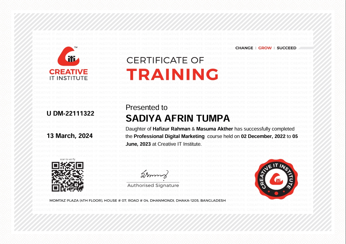 I further honed my skills with a Digital Marketing Diploma from Creative IT Institute, one of South Asia’s leading IT centers. This course gave me hands-on experience in SEO, social media management, Google Ads, and WordPress design.